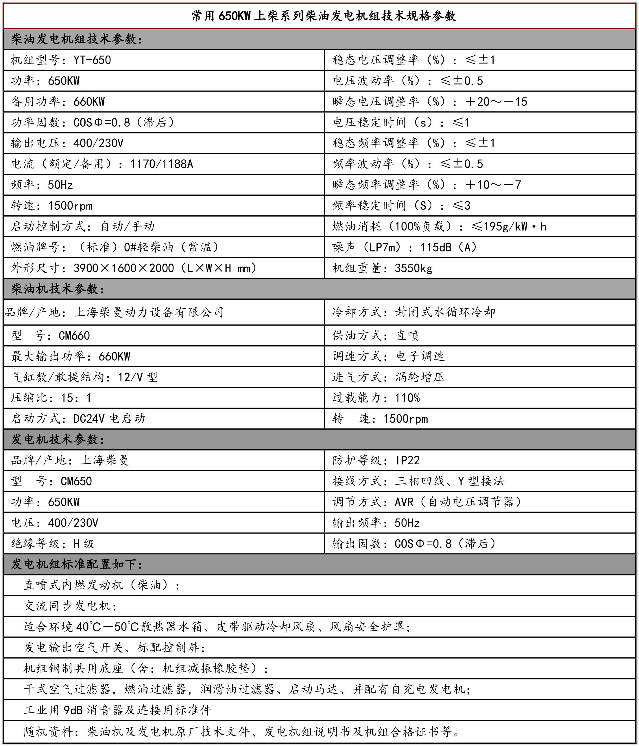 发动机:上柴柴曼 功率:650kw 结构类型:标准型 可选结构类型:静音型、移动型